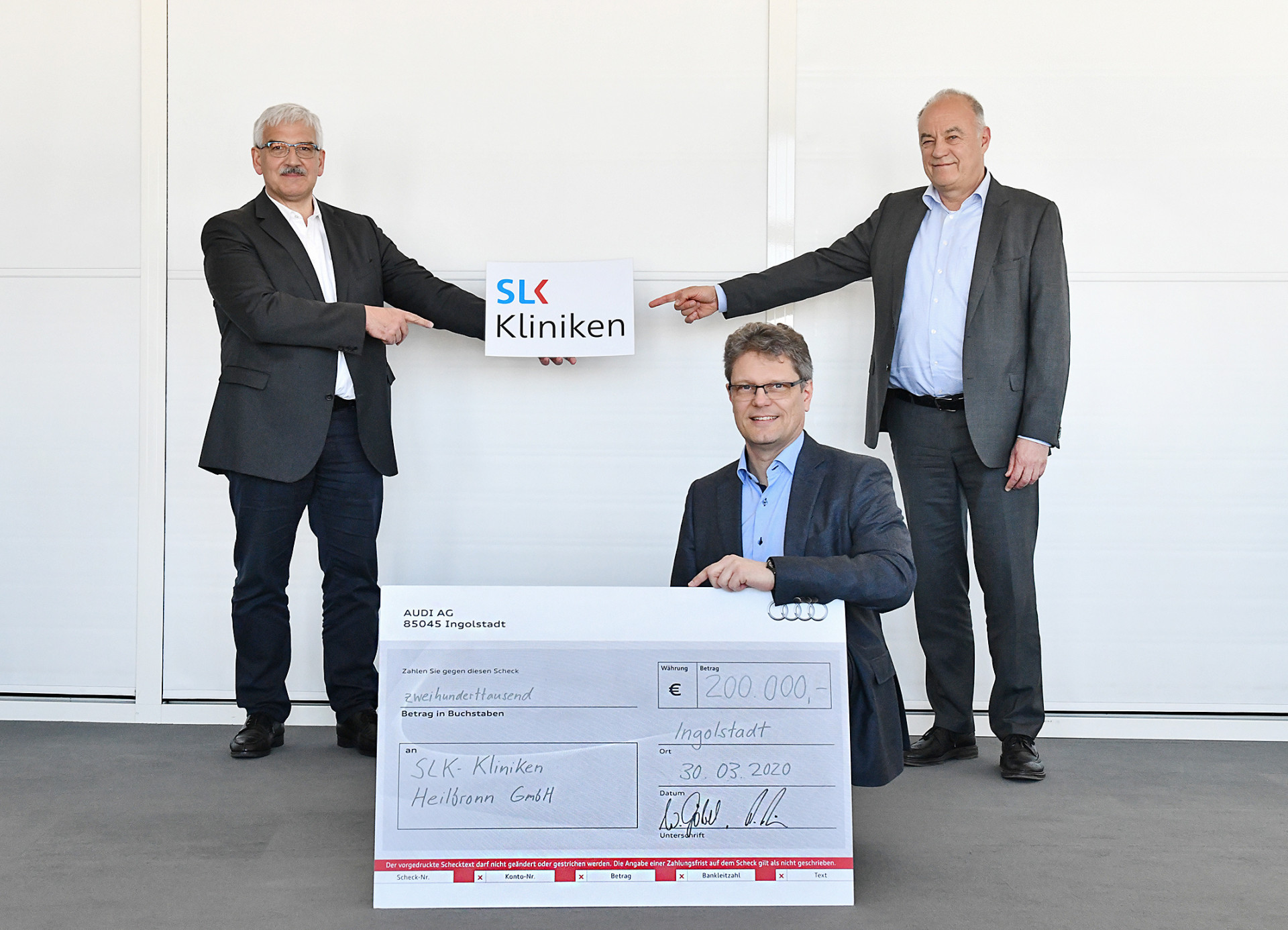 Ingolstadt/Neckarsulm, March 30, 2020 – In times of the corona pandemic, the handing over of a donation also looks different. Today, Monday, March 30, 2020, Audi’s Board of Management Members Peter Kössler, responsible for Production and Logistics, and Wendelin Göbel, responsible for Human Resources, together with the “Doctor in Chief” at Audi Dr. Andreas Haller, Head of Audi’s Healthcare department, handed over a symbolic check to hospitals in the home regions of Ingolstadt and Neckarsulm – in virtual form of course. The Ingolstadt Hospital will receive 400,000 euros and the SLK Hospitals in Heilbronn will receive 200,000 euros. As a first step, Audi will also provide 10,000 medical masks for the Ingolstadt region and 5,000 masks for the Neckarsulm region in the next few days. In Ingolstadt, for example, they will be sent to a central coordinating body, the Disaster Control Management Group, which will then distribute the masks to hospitals, care homes, doctors in private practice and the public health system.