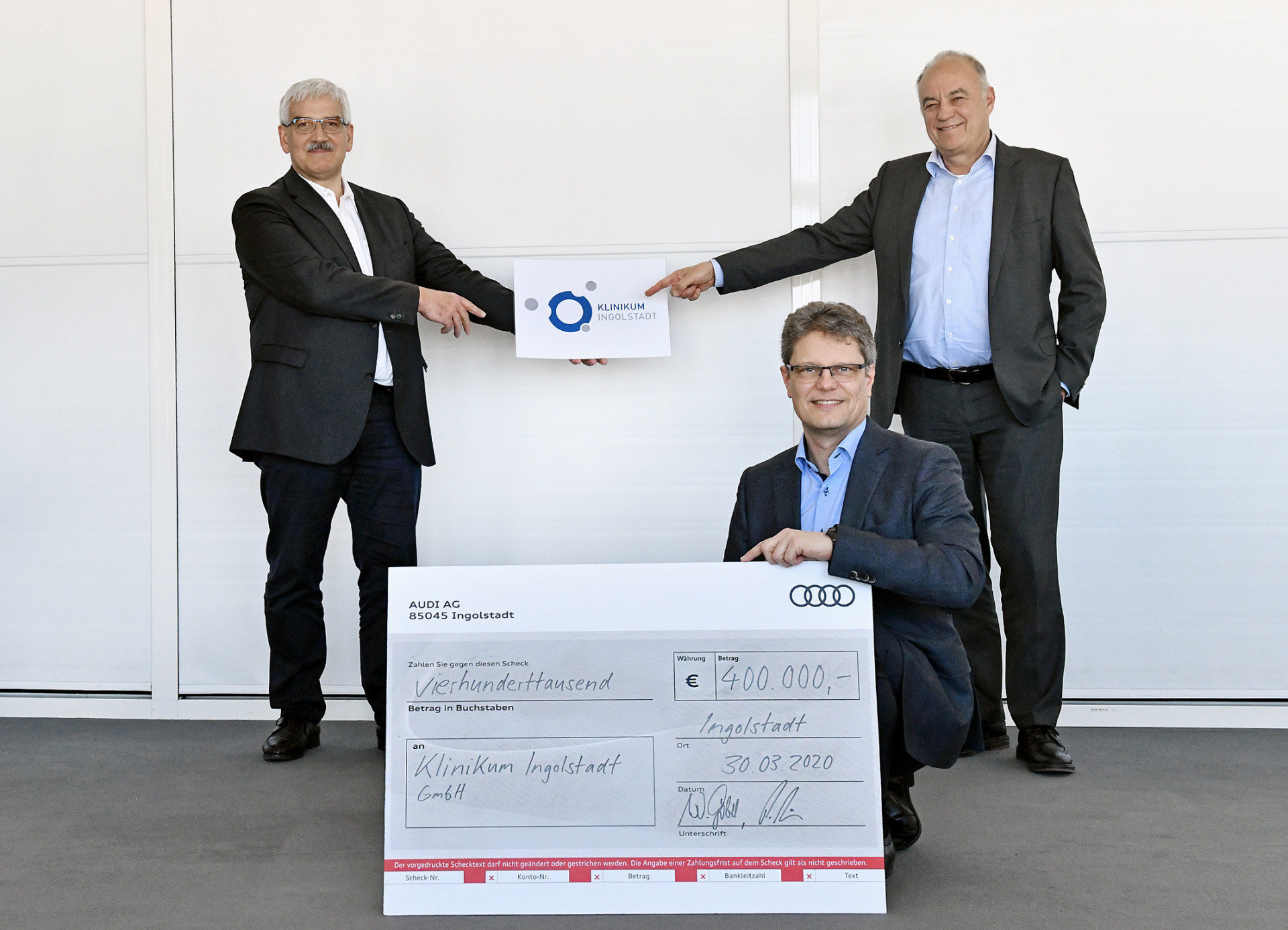 Audi’s managers Peter Kössler, Wendelin Göbel and Andreas Haller handed over a symbolic check to the Ingolstadt Hospital, Germany (author: Audi)
